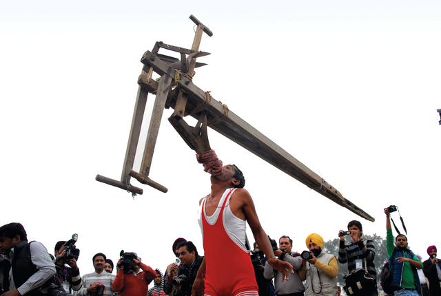 في قرية كيلا رايبور الهندية يقام سنويا مطلع شهر فبراير منذ العام 1933 أولمبياد الريف الهندي، هذه القرية التي تبعد 20 كيلومتراً من مدينة لوديانا، يتوافد إليها القرويون والفلاحون، الذين يحلمون بتحقيق ألقاب وأرقام قياسية ونيل جوائز في مهارات أحيانا تكون غريبة، مثل مهارة هذا الرجل، الذي حمل أمس بأسنانه محراثاً عملاقا، لا يمكن أن يجره إلا مجموعة من الثيران، وأمضى بين فكيه عدة دقائق أمام ذهول المشاهدين والمصورين. ويتوافد على القرية الصغيرة مشاركون وجمهور وإعلاميون من الهند ومن خارجها لمشاهدة غرائب المهارات والتحديات.