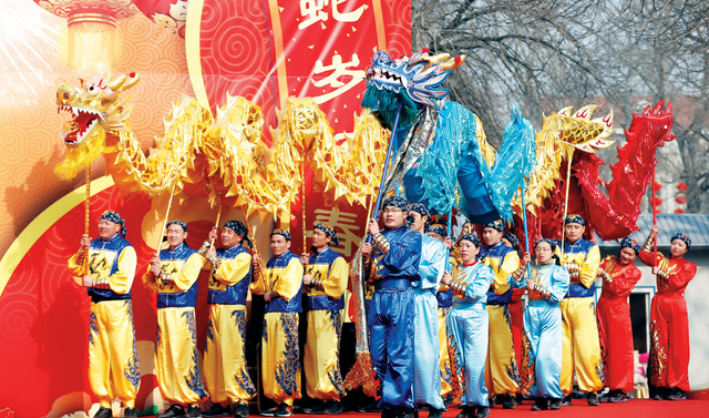 مهرجان الربيع غيتيأعضاء من الفرقة الشعبية الصينية بألوانها الحمراء والصفراء والزرقاء يحملون فوق رؤوسهم مجسماً للتنين رمز الصينيين يؤدون لوحة راقصة خلال حفل افتتاح مهرجان الربيع في حديقة البحيرة وسط العاصمة بكين.