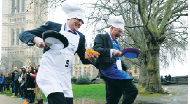 مايك كروكارت عضو البرلمان عن غرب ادنبره (يسار) واللورد سانت جون من بليستو يرتديان ملابس الطهاة ويتنافسان بحماس و فرح خلال مشاركتهما في سباق فطائر البانكيك الخيري الذي يقام بمناسبة ثلاثاء المرافع امس امام مبنى البرلمان في لندن. ومن التقليدي في المملكة المتحدة ان يتناول الناس فطائر البانكيك في هذه المناسبة