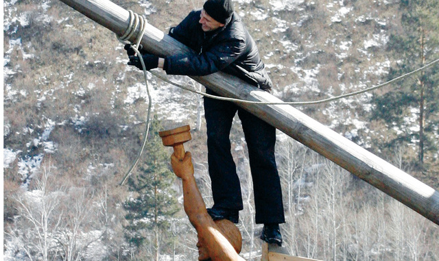 ربان سفينة شراعية تقليدية يتفقد حبالها وعدتها، وقد وضع قدمه على رأس تمثال خشبي يزين مقدمتها في نهر في منطقة سيبيريا تايجا التي تبعد 520 كيلومتراً جنوب مدينة كراسنويارسكي الروسية.
