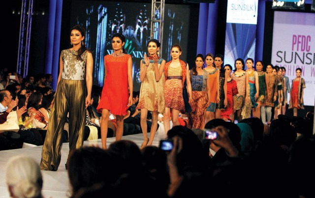 أثواب وقامات أ بعارضات أزياء باكستانيات يناطحن بطولهن وأناقتهن الأعين التي حجزت لها مقاعد مخصصة لرؤية ألق الأثواب المنسدلة، من تصميم نيكي نينا، خلال عروض أسبوع الموضة في باكستان، أول من أمس.