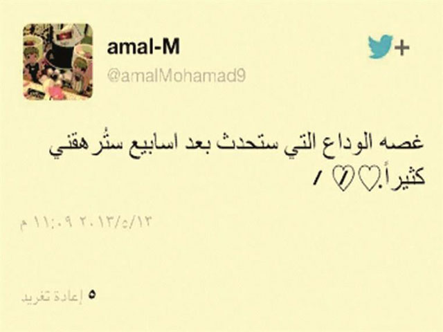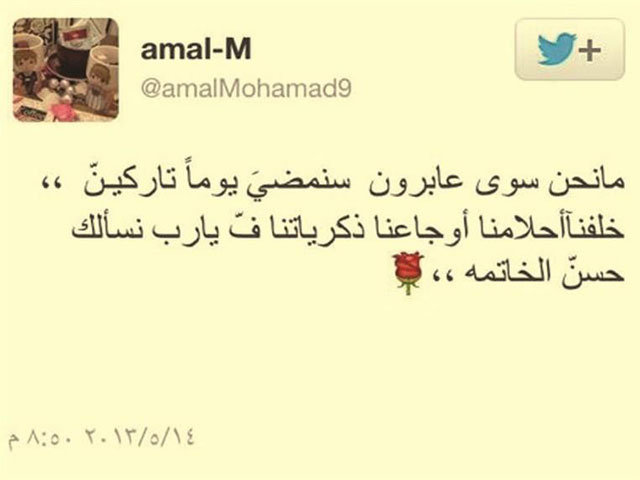 وقالت المعلمة أمل المعيلي، قبل رحيلها على حسابها بموقع التواصل الاجتماعي "تويتر": «غصة الوداع التي ستحدث بعد أسابيع سترهقني كثيراً»، «ما نحن سوى عابرين سنمضي يوماً تاركين أحلامنا وأوجاعنا ذكرياتنا.. يا رب نسألك حسن الخاتمة».