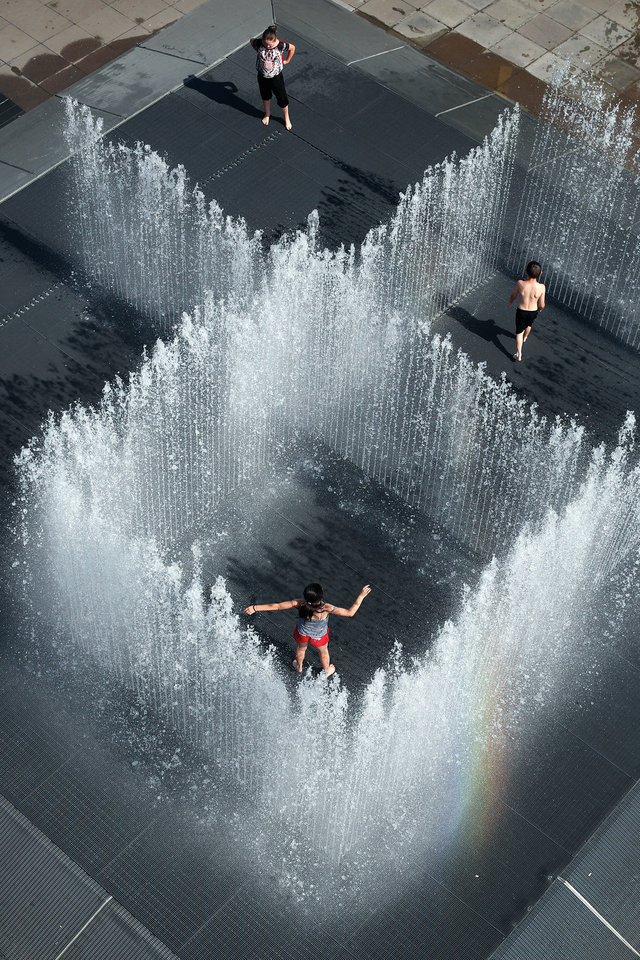 غرف مائية غيتيأطفال يلعبون داخل مربعات نوافير المياه، صممها الفنان الدنماركي جيب هين، تحت عنوان "الغرف الظاهرة"، أو "الغرف المائية"، وذلك في جنوب انجلترا، حيث تصاعدت درجات الحرارة إلى أعلى مستوياتها أمس.