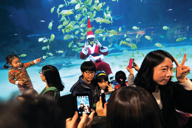 لقطة أ ف بغطاس يرتدي زي بابا نويل يسبح بين رفوف متنوعة من الأسماك في اوكواريوم في مدينة سيؤول أمس،وامامه اطفال وزائرون يلتقطون صورا تذكارية ، حيث يسجل هذا الحوض حركة زائرين خلال موسم عيد الاعياد .