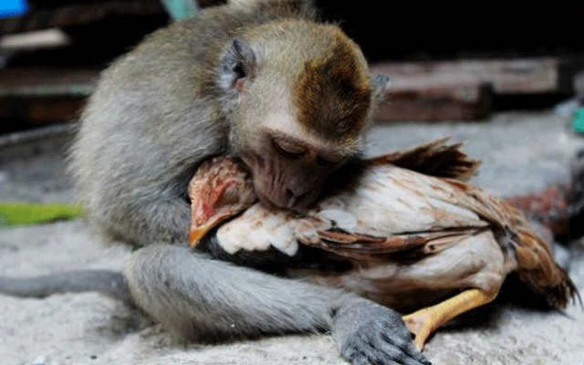وقع قرد في غرام دجاجة من النظرة الأولى، حين شاهدها في سوق محلية بجزيرة جاوة الإندونسية، بينما كان برفقة مالكه.