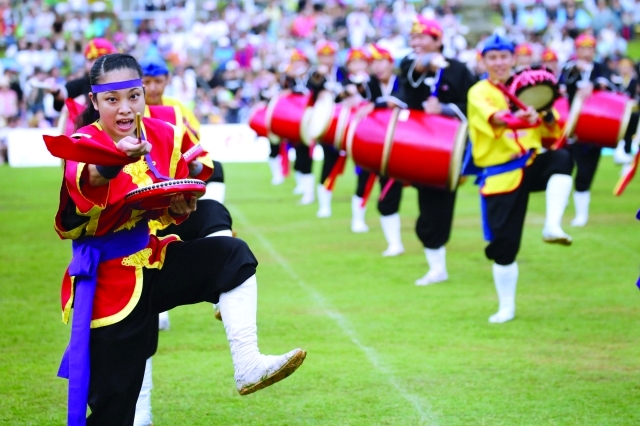 استعراض أيه بي ايمشاركون في مهرجان ايسا خلال استعراض في مدينة كوزا الرياضية بمقاطعة أوكيناوا اليابانية التي تستضيف المهرجان التاسع والخمسين ويحتفي المهرجان بالموسيقى والرقص على انغام الطبول وكان الهدف منه في الاصل الترحيب بأرواح الأجداد في فصل الصيف.