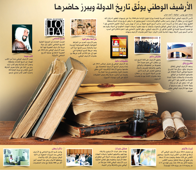 تأسس الأرشيف الوطني لدولة الإمارات العربية المتحدة بوزارة شؤون الرئاسة عام 1968 بناءً على توجيهات المغفور له بإذن الله الشيخ زايد بن سلطان آل نهيان، باسم «مكتب الوثائق والدراسات»؛ لجمع وتوثيق كل ما يخصّ تاريخ وتراث الدولة ومنطقة الخليج. وبعد أربعين عاماً من تأسيسه، أصدر صاحب السمو الشيخ خليفة بن زايد آل نهيان رئيس الدولة، القانون الاتحادي رقم 7 لسنة 2008 بتحويله إلى المركز الوطني للوثائق والبحوث، وأنيطت به مهام تنظيم أرشيفات الجهات الحكومية في الدولة، وفيما بعد تمّ تعديل التسمية الواردة في القانون المذكور إلى «الأرشيف الوطني»، وفق القانون الاتحادي رقم 1 لعام 2014م الذي أصدره صاحب السمو رئيس الدولة. وبهذه المناسبة تقدم «البيان» عرضاً لأهم مقتنيات الأرشيف ومهامه.