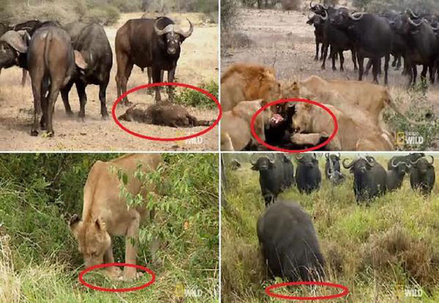 وحسب الفيديو الذي سيتم بثه في التاسعة مساء الجمعة القادم بتوقيت الولايات المتحدة الأميركية؛ يعيش الجاموس البري في قطعان؛ لذا فإنه حين اصطاد قطيعُ أسود صغيرَ الجاموس، تجمع أفراد القطيع وأجبروا الأسود على ترك الصغير، لكن الوقت كان قد تأخر، فقد فارق الصغير الحياة.