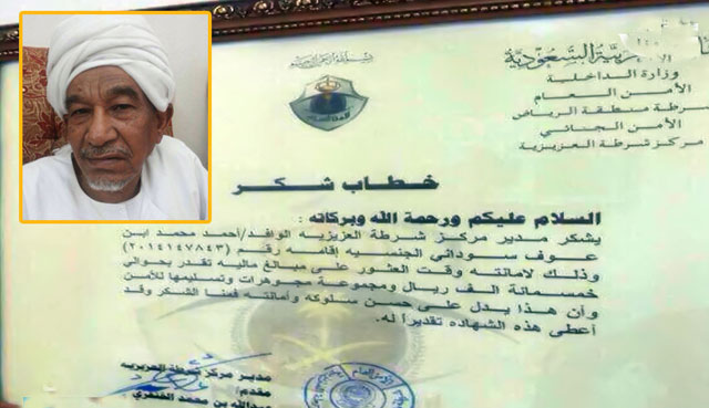 كرّمت شرطة العزيزية بمنطقة الرياض بالسعودية ممثلة في مديرها المقدم عبدالله محمد الغنفري، المقيم السوداني أحمد محمد ابن عوف، بمنحه شهادة شكر، وذلك نظير أمانته المتمثلة في إعادة مبلغ مالي يفوق النصف مليون ريال، مع نصف كيلو من الذهب.