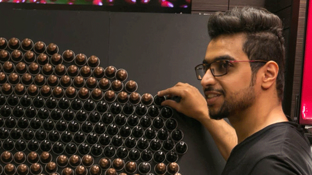 وأضاف "ان عشقه للقهوة دفعه للرسم بالمكونات الأخرى للقهوة، لذلك رسم عدداً من الرسومات باستخدام القهوة نفسها، وبعد ذلك استخدمت السكر في رسومات أخرى، ولم يتوقف عند هذا الحد، بل أيضاً استخدم العود الخشبي الذي يستخدم لتحريك السكر في القهوة، وذلك من خلال تجميع عدد من هذه الأعواد، والرسم عليها بالنار، وظن أنه بذلك قد انتهيت من الرسم بجميع مكونات القهوة وأدواتها، ولكن في يوم من الأيام تبادر إلى ذهنه فكرة بالاستفادة من الظل الذي يتكون من كوب القهوة، لذلك قام بتفريغ كوب القهوة باستخدام مشرط الجراحة، وأسقط عليها ضوء الشموع من أجل أن يرسم لوحات باستخدام هذا الظل، وقد قام مؤخراً بالرسم باستخدام الظل في الرسم، مستخدماً 4000 آلالف كوب وشمعة في فعالية أقيمت تضامناً مع عاصفة الحزم.