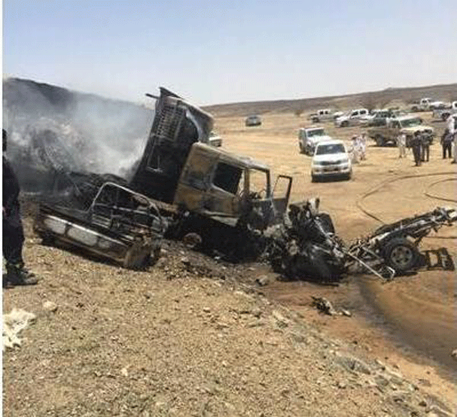 فوجئ أحد رجال الدفاع المدني بمحافظة الخرمة السعودية، لدى مباشرته حادثاً مرورياً على طريق الخرمة – رنية بالقرب من محطة الكيلو (40)، أن والده داخل السيارة الجيب التي تحترق أمامه بعد تصادمها مع شاحنة، وقد وفاته المنية.