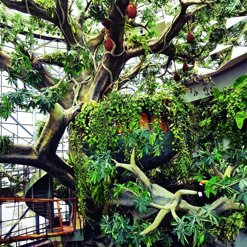 ثلاثة آلاف صنف مختلف من كائنات تبدأ من الفراشات ولا تنتهي عند «الدب الكسلان».. شجرة بارتفاع 25 متراً.. جسور معلقة فوق شلالات يرفرف فوق أغصانها 40 طيراً من طيور الأمازون.. نسائم تلفح الوجه.. ضوء ساطع يتسلل من قبة زجاجية تعتبر الأولى بالمنطقة التي تؤمن التوازن الطبيعي، تتمركز وسطها أضخم شجرة صناعية مستدامة في العالم.. هذا غيض من «أوكسيجين» مشروع «جرين بلانيت» الذي طورته شركة «مراس القابضة» في «سيتي ووك دبي».