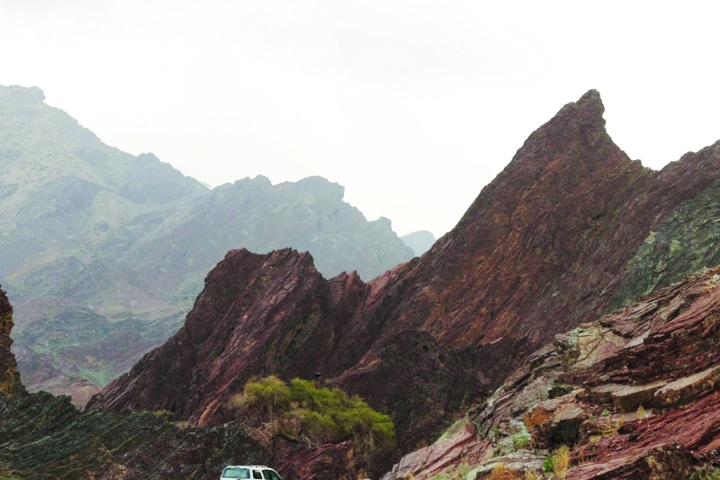 ننظر إلى ارتفاع الجبال فوقنا فنشعر بالرهبة، لطبيعة الصخور الضخمة، فثمة صخرة في شكل كتلة واحدة ملساء بارتفاع برج من أربعين طابقاً، وتنظر حولك فترى جبالاً في كل مكان، صخورها ملونة، بعضها أحمر والبعض بني غامق ومن بعيد هنالك جبال بيضاء الصخور، وتتخذ أشكالاً فنية تشبه المنحوتات العملاقة، وفي جدران تلك الصخور الهائلة نرى كهوفاً عديدة مغطاة بأخشاب وأعشاب، نسأل ما هذا؟