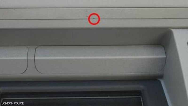 واكتشفت شرطة لندن كاميرات خفية صغيرة للغاية مخبأة بشكل جيد في أجهزة الصراف الآلي، تقوم بتسجيل الأرقام السرية لبطاقات الزبائن.