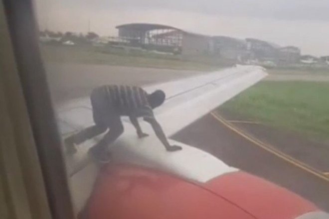 فقبل إقلاعها بقليل، وبينما كانت تنتظر الحصول على تصريح بالإقلاع من مطار مورتالا محمد، فوجئ الركاب داخل طائرة بوينغ 737 تابعة لشركة طيران "أزمان إير" في لاغوس بنيجيريا برجل يتسلق جناح الطائرة، بينما كانت تستعد للإقلاع متوجهة إلى مدينة هراكورت.
