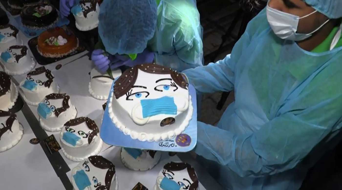 مع تفشي فيروس كورونا في معظم دول العالم، تكثر إرشادات التوعية بطرق مختلفة، ففي غزة صنع إياد أبو زرقة "كيكة كورونا" تصور امرأة تضع كمامة طبية على وجهها، لحمل الناس على الوقاية.