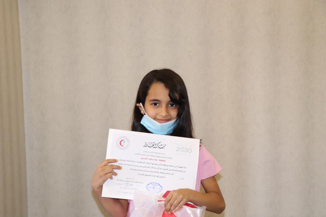 وكرّم مدير عام فرع هيئة الهلال الأحمر السعودي بمنطقة حائل عبدالرحمن بن حمد اليحياء الطفلة غلاء ماجد الشمري "11 عاماً"، التي أسهمت في إنقاذ حياة والدها بعد تعرضه لوعكة صحية، وإظهار شجاعتها وثقتها من خلال تواصلها مع غرفة العمليات وإعطائهم كل المعلومات بشكل دقيق وصحيح.