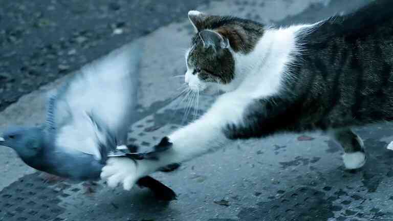 أمسك القط لاري، صائد الفئران الأول بمقر إقامة رئيس الوزراء البريطاني في داونينغ ستريت، حمامة أمام الصحفيين، إلا أنها تمكنت من الإفلات من مخالبه.