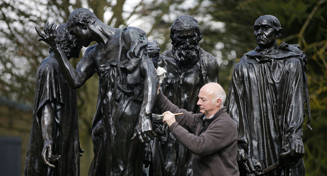 معرض جيتيمشرف من مؤسسة هنري مور في مدينة بيري جرين في إنجلترا، ينظف عملاً فنياً على شكل منحوتات، استعداداً لمعرض فني ضخم يفتح أبوابه للجمهور 29 الجاري، ويستمر حتى 27 أكتوبر المقبل، ويشارك فيه نحاتون بريطانيون ودوليون بمنحوتاتهم، المستمدة من الفنون العصرية.