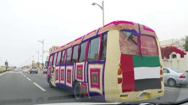 زخارف تصوير - رشا المالححافلة ملتحفة ببساط محاك بالسنارة ويحمل زخارف محلية يزينها علم الإمارات في شارع جميرا في دبي امس و هي عبارة عن مبادرة (في حب الامارات ) ينظمها "مشغل الخلية" بالتعاون مع مواصلات الإمارات.