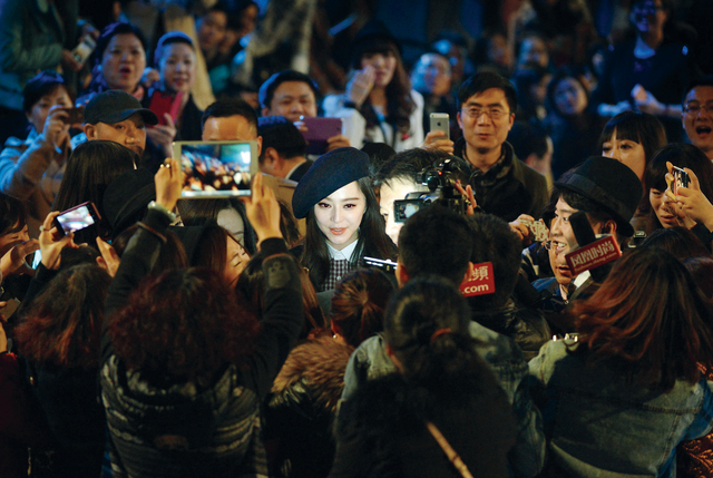 الممثلة والمغنية الصينية فان بينغ تطل بالقبعة السوداء ويتجمهر حولها حشد من المعجبين ورجال الصحافة والإعلام لدى وصولها أمس لحضور احتفال في العاصمة بكين ويحاول العديد من المصورين التقاط صورة في اللحظة التي كانت تدخل فيها الفنانة الصينية إلى الحفل فيما انشغل آخرون بتوقيع اوتوغرافات منها.