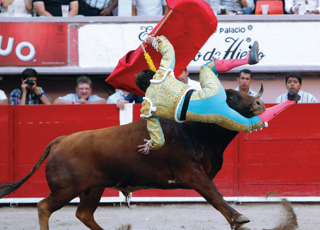 لقطة أي بي أيهمصارع الثيران المكسيكي أوتيرو سالديفار في حركة خطيرة، أول من أمس، كادت أن تودي بحياته في مهرجان لمصارعة الثيران في مدينة أوكدجوسلينس المكسيكية، ومازالت هذه الرياضة الضاربة في التقاليد الإسبانية واللاتينية تحصد الأرواح سنوياً، في ظل مطالب بتوقيفها.