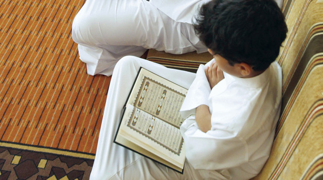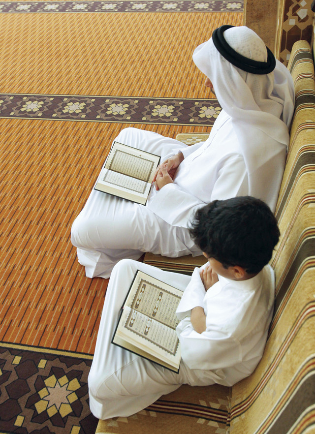 تعد العشر الأواخر من رمضان أفضل أيام الشهر الفضيل أجراً وثواباًَ، حيث ينصرف الصائمون الى الاعتكاف في المساجد والاكثار من صلاة التراويح والدعاء والتهجد. وفي الصورة رجل والى جانبه طفل صغير يتلوان القرآن الكريم داخل مسجد سلطان يوسف الأهلي بمنطقة عود المطينة في دبي.