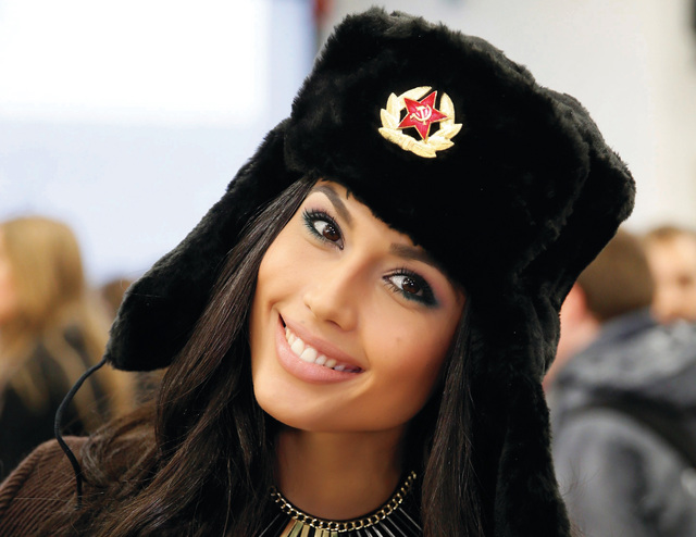 الجميلة «الحمراء» أي بي أيهملكة جمال إسبانيا 2013، باتريسيا يارينا، حاولت أمس، استعادة بعض الإرث السوفييتي، حيث ارتدت قبعة تقليدية، تحمل شارة النجمة الحمراء، الممهورة بالمطرقة والمنجل، في فعالية نظمت في ضواحي العاصمة الروسية موسكو.