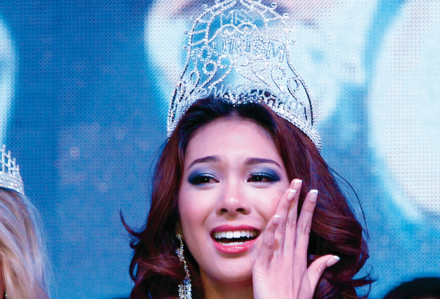 الفلبينية انجلي ديون غوميز يبدو عليها التأثر والفرح، بعد فوزها بلقب ملكة جمال السياحة الدولية لعام 2013، خلال منافسة حصلت في بوتراغايا خارج العاصمة كوالالمبور في ماليزيا، أمس، في حين حصلت مواطنتهابياروز سانتياغو منذ أسبوعين على لقب ملكة جمال العالم لعام 2013.