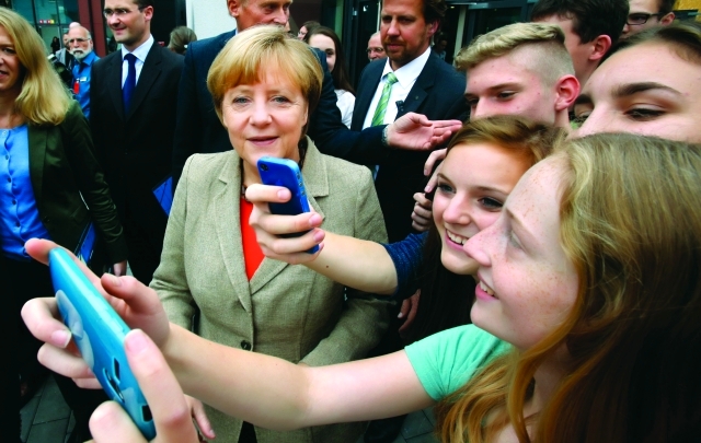 سيلفي مع المستشارة أ بفرحة كبيرة، غمرت التلاميذ وهم يقفون بجانب المستشارة الألمانية أنجيلا ميركل أمس، لالتقاط صور «سيلفي» معها، وذلك أثناء زيارتها مدرسة برايلات ديهل، في كروس جيراو بألمانيا.