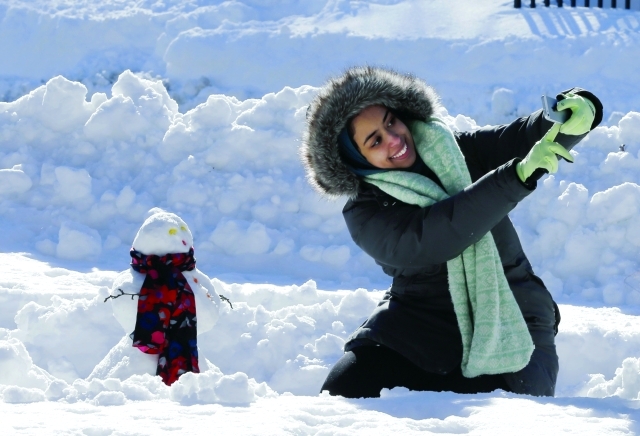 سيلفي رجل الثلج إ بطالبة صنعت من الثلج وأكوامه التي تجمعت في شيكاغو الأميركية أمس، مجسماً لرجل ثلج، زينت به «سيلفي» التقطته أمس، وهي مبتهجة ببساط الطبيعة.