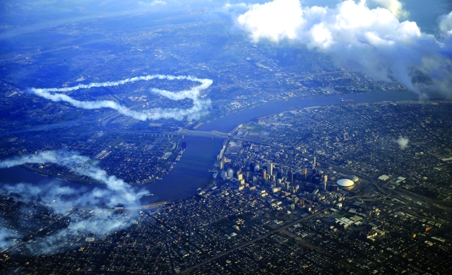 رسائل السلام أ.بقلب عملاق من السحب وقت الغروب، رسمته طائرة، ضمن عروض جوية احتضنها أمس مهرجان موسيقى وتراث الجاز في مدينة نيو أورليانز الأميركية، حيث قدمت العديد من العروض في سماء المدينة، كتب فيها الطيارون في الأجواء مجموعة من رسائل المحبة والأمل والسلام.