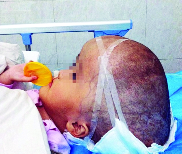 وخضعت الطفلة أخيراً لعملية جراحية استغرقت 17 ساعة، وهي تتماثل للشفاء الآن. وذكر الأطباء الصينيون أن حالة الطفلة كانت حرجة، حيث إن السوائل شكلت 85 % من الدماغ، في حالة تدعى «استسقاء الدماغ»، الأمر الذي ساهم في تضخم حجم الجمجمة. لتبلغ أبعاد محيطها 20 سم × 20 سم. ويكمن خطر الاستسقاء في أن السوائل الزائدة تضغط على الدماغ، إلى حد الإضرار به.