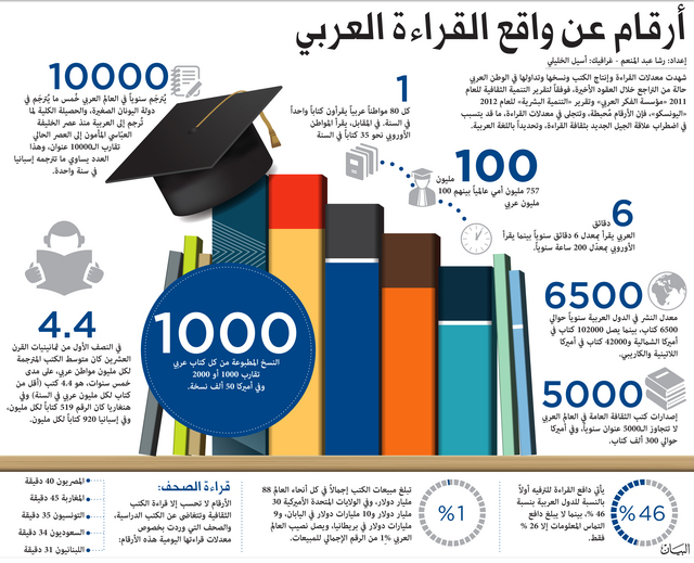 شهدت معدلات القراءة وإنتاج الكتب ونسخها وتداولها في الوطن العربي حالة من التراجع خلال العقود الأخيرة، فوفقاً لتقرير التنمية الثقافية للعام 2011 الصادر عن «مؤسسة الفكر العربي» وتقرير «التنمية البشرية» للعام 2012 والصادر عن «اليونسكو»، فإن الأرقام مُحبطة، وتتجلى في معدلات الطباعة والقراءة، ما قد يتسبب في اضطراب علاقة الجيل الجديد بثقافة القراءة، وتحديداً باللغة العربية التي هي واحدة من أغنى لغات العالم وأكثرها ثراء، وعلى مدار قرون طويلة متتابعة أنتجت ميراثاً ثقافياً وإبداعياً كبيراً ومتميّزاً.