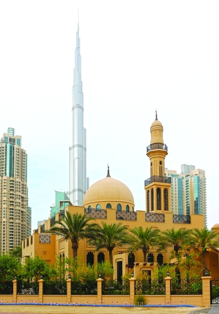 المئذنة والبرج ■ مئذنة مسجد «الغفور» ويطل خلفها برج خليفة، المعلم الحضاري العالمي، في تناغم بين الهوية الحضارية والروح المعاصرة، ويعد المسجد الذي يقع في منطقة البرج وسط دبي تحفة معمارية.