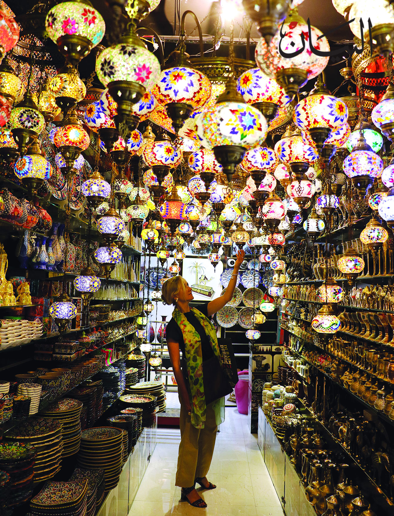 هنا ديرة.. قلب دبي التاريخي الذي لا يزال ينبض بعبق التجارة عبر أسواقها التي تتعدد اختصاصاتها تعدد أذواق قاصديها.. هنا سائحة تمعن النظر في ثريات ذات تصميمات فريدة في أحد المحال المخصصة للأضواء والثريات في سوق ديرة.