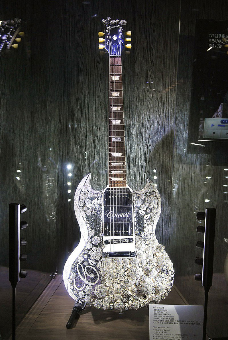 وسيتمكن زوار المعرض - الذي يقام في مركز أبوظبي الوطني للمعارض - من إلقاء نظرة على الغيتار المرصع بأكثر من 11,441 قطعة ألماس، والبالغ وزنه حوالي 1.6 كيلوغرام من الذهب الأبيض والذي صممه الفنان مارك لوي، وعمل على تصميمه 68 حرفيا، واستغرق إنجازه 700 يوم.