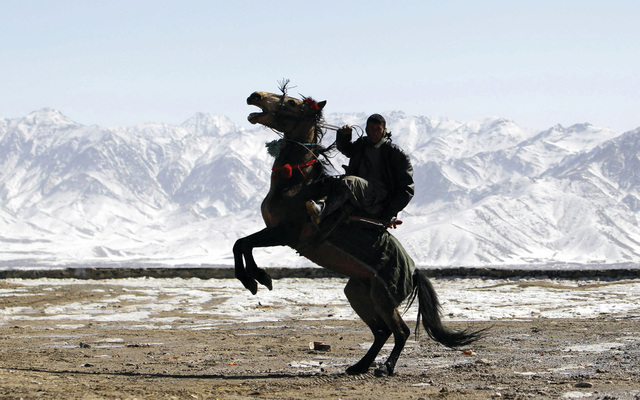 رجل على صهوة جواده يمارس هوايته المفضلة بتدريب حصانه على القفز في الهواء، متحدياً موجة الصقيع القاسية على إحدى القمم المطلة على العاصمة الأفغانية كابول التي يكسوها الثلج الأبيض بحلته الجميلة والتي يزيدها فخامة وأبهة. إنها براعة الهواية وذروة الشجاعة بالرقص فوق الجليد المتراكم الذي يتربع فوق القمم الجرداء فيحولها شرايين نابضة بالحياة. ()