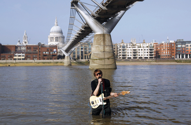 هواية «رويترز »عازف غيتار يمارس هوايته الغريبة وهو واقف على ضفة نهر التايمز في وسط مدينة لندن خلال فترة الجزر وانخفاض مستوى المياه في النهر.
