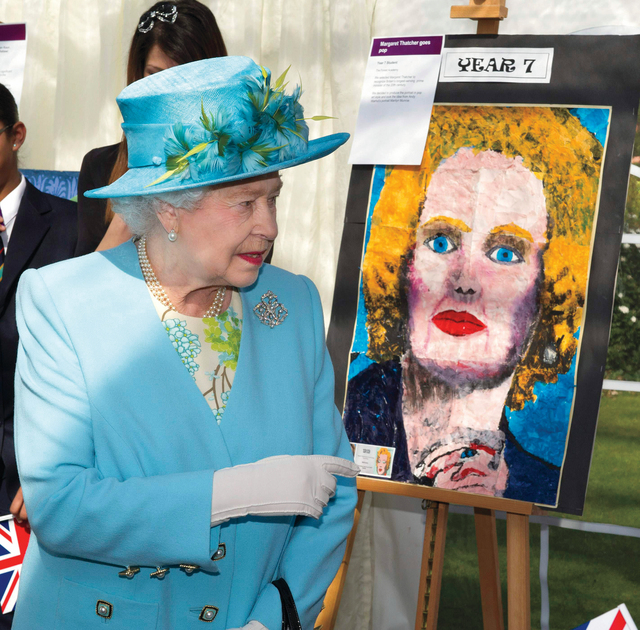تاتشر .. ذائقة ملكية «رويترز»الملكة البريطانية إليزابيث الثانية تطّلع على صورة لرئيسة الوزراء البريطانية السابقة مارغريت تاتشر رسمها طلاب أكاديمية فوريست بأسلوب الفنان آندي وارهول، وذلك خلال زيارتها لحديقة ونُزل فالنتاينز في ريدبريدج جنوب انجلترا.