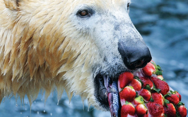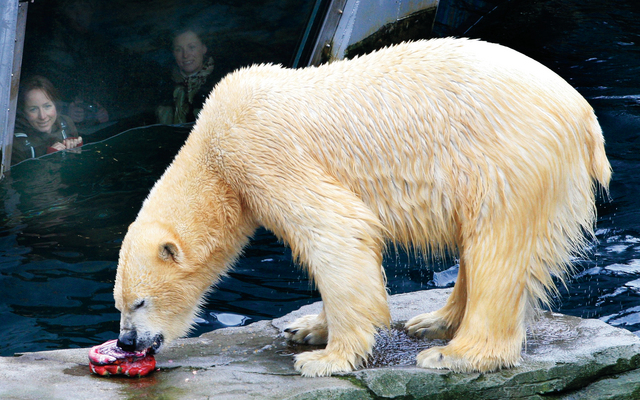 لقطة أي بي إيهالدب القطبي أركتوس يتناول كعكة آيس كريم في حديقة حيوان يوكون باي في هانوفر بألمانيا. يغادر الدب الحديقة إلى حديقة مفتوحة في إسكتلندا في إطار برنامج الحفاظ على الأنواع المهددة بالانقراض.