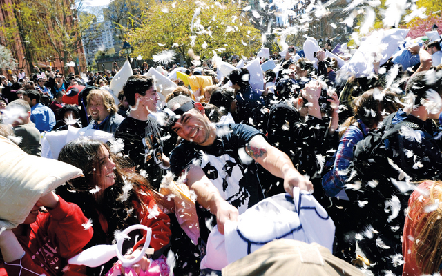 نيويورك.. مهرجان الوسائد (أي بي إيه)مشاركون في مهرجان التراشق بالوسائد في ميدان سكويربارك في مدينة نيويورك يستمتعون برشق بعضهم البعض بالوسائد. التقليد يرجع إلى مدينة تورنتو الكندية، لكن نحو 150 مدينة في العالم تحتفل به بنفس الطريقة.
