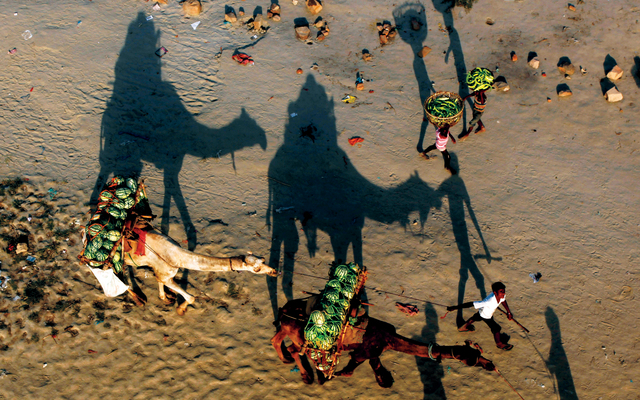 لقطة (أ بمزارعون هنود ينقلون منتوجاتهم على ظهر الجمال إلى السوق على طول نهر الغانج في مدينة الله آباد في الهند. )