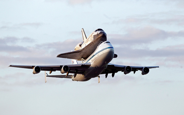متحف أ ب )تم نقل مكوك الفضاء الاميركي ديسكفري الى متحف سميثونيان الوطني للطيران والفضاء في واشنطن، وتوضح الصورة طائرة بوينغ 747 وهي تحمل المكوك من قاعدة كينيدي الجوية أمس. (