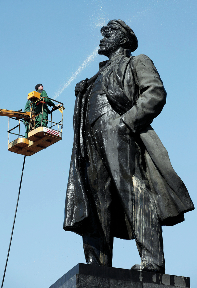 لقطة (رويترز)عامل تنظيف يقف على رافعة وقد فتح الماء لغسل تمثال فلاديمير لينين، مؤسس الدولة السوفييتية، المنتصب وسط مدينة كراسنويارسك الروسية، استعداداً لاحتفالات بمناسبة الذكرى 142 لميلاده، والتي تحل غداً.