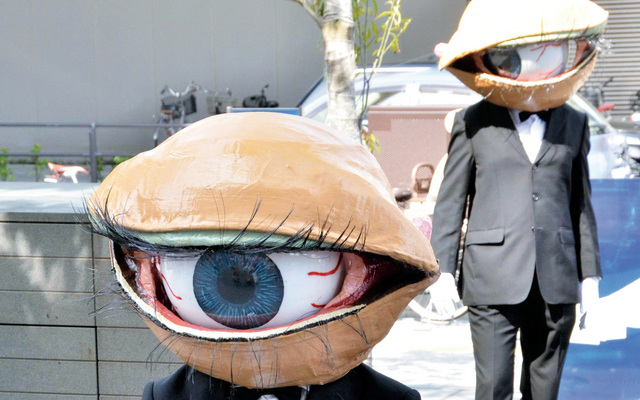 مهرجان "أ ف بعضوا فريق التمثيل الياباني "ميدمان ميدمان" يعتمران قبعات على شكل عيون كبيرة في أحد شوارع طوكيو، بمناسبة مهرجان الربيع السنوي ."