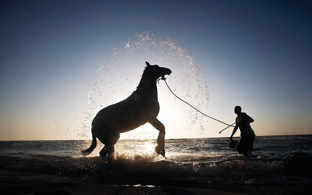 لقطة أيه. بي. إيرجل فلسطيني يغسل حصانه بمياه البحر غرب غزة، والحصان كما يبدو في الصورة، سعيد برذاذ المياه التي تتبعثر على رأسه وجسده، وهو يخاطب سيده بلغة لا يعرفها سوى البحر.