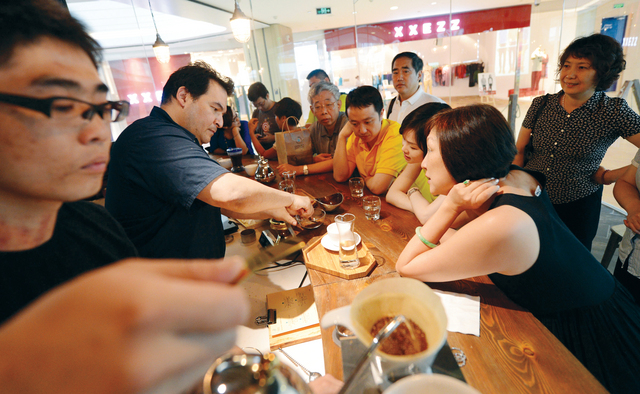 مالك القهوة العضوية الخضراء، جيم لي، الثاني إلى اليسار، يعطي تعليمات للمشاركين الصينيين من أجل جلب ثقافة القهوة من كاليفورنيا الجنوبية إلى الصين، عبر تذوق القهوة بقطعها وتحميصها في بكين. ولا بد من الإشارة إلى أن ثقافة القهوة جديدة نسبياً في الصين.