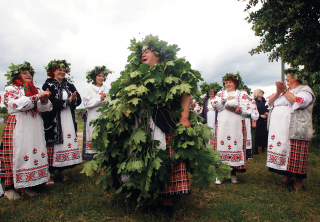 طقوس (رويترز)سيدة من روسيا البيضاء تدثرت، أمس، بأغصان شجرة «بتولا»، قرب العاصمة مينسك، فيما أحاطت بها نساء قرويات، في طقوس قديمة يعتقدون أنها تجلب الحصاد الوفير.