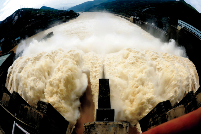 المياه تتدفق بعنف وقوة، في أمواج متداخلة من سد خزان يقع على نهر مينجيانغ في الصين أول من أمس. وقام المسؤولون الصينيون بإطلاق مياه السد كجزء من التدابير والتدريبات للسيطرة على الفيضانات قبل موسم الامطار في مدينة مينكنغ في مقاطعة فوجيان جنوب شرق الصين.